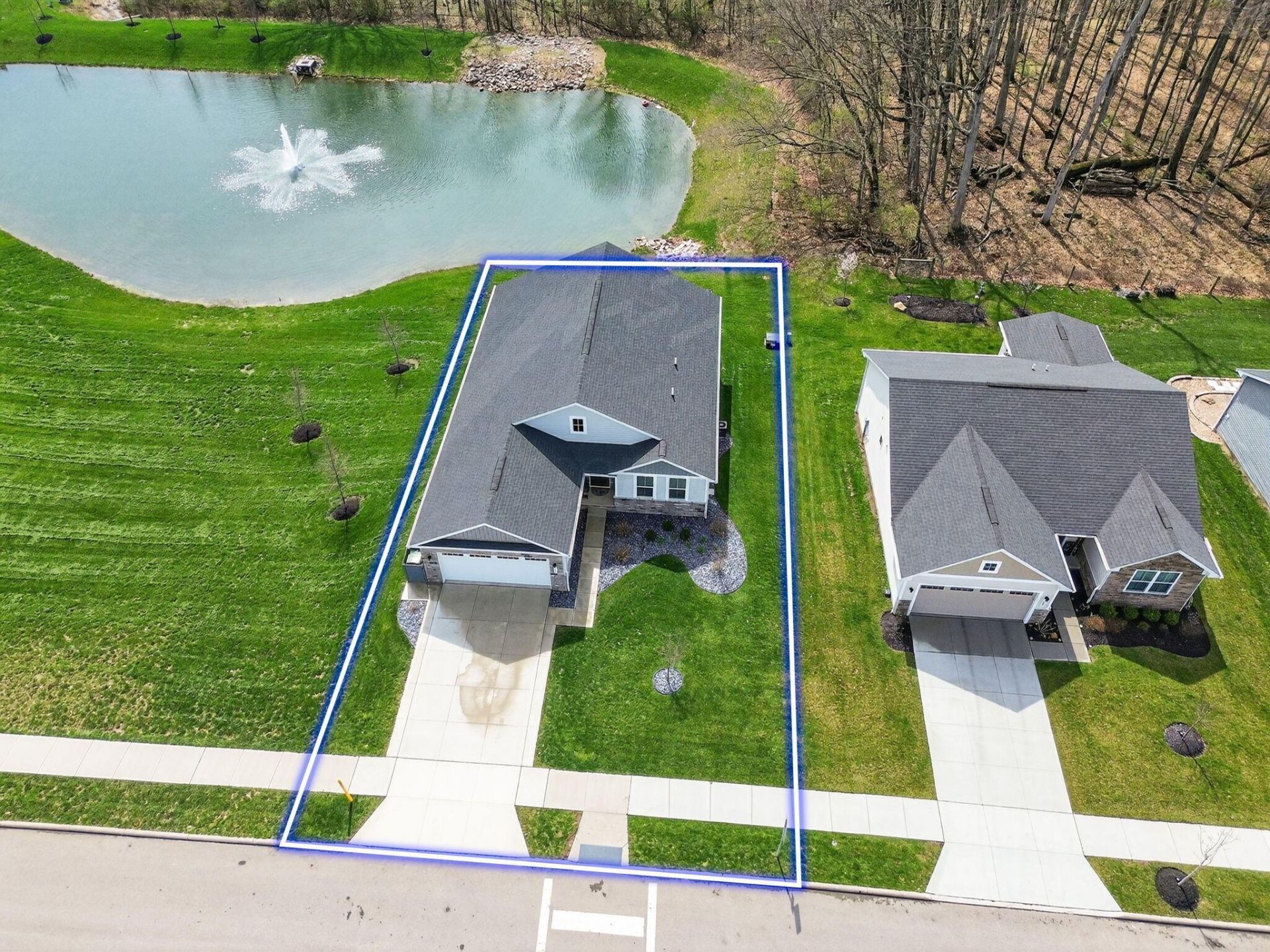 Discover this beautifully upgraded home situated on a premium lot at the very back of the subdivision, offering minimal traffic and exceptional privacy with serene pond and wooded views. This rare 3-bedroom plus office floor plan is thoughtfully designed, with guest bedrooms and a private office located off the main hallway, while the primary suite is tucked away in the rear of the home, perfectly positioned to overlook the peaceful natural setting. The office features elegant double French doors, creating an ideal space for working from home. The kitchen is both stylish and functional, showcasing quartz countertops, crown-molded cabinetry with convenient pull-out drawers, a neutral tile backsplash, and custom pantry shelving. Designed for low-maintenance living, the exterior includes slate chip (stone mulch) landscaping, an expanded driveway, and an enclosed trash can area on a concrete base. Enjoy outdoor living on the 11' x 20' raised deck, complete with stairs to the yard and tranquil pond and wooded views. Gutter guards add additional convenience. Inside, the great room media wall with a 65'' TV and electric fireplace (both included) creates a cozy focal point, while custom window trim with sills throughout and 2'' blinds add a polished touch. The laundry room is exceptionally well-equipped with a raised washer and dryer with storage below, overhead cabinetry, and ample storage space. The primary bedroom closet features a custom organization system. The partially finished basement includes two generously sized windows, a workspace with included cabinetry, and an active radon mitigation system. Additional highlights include an insulated and painted garage with an epoxy floor and a SimpliSafe security system. Enjoy easy, low-maintenance living with HOA services covering lawn mowing and snow removal for just $117/month.
